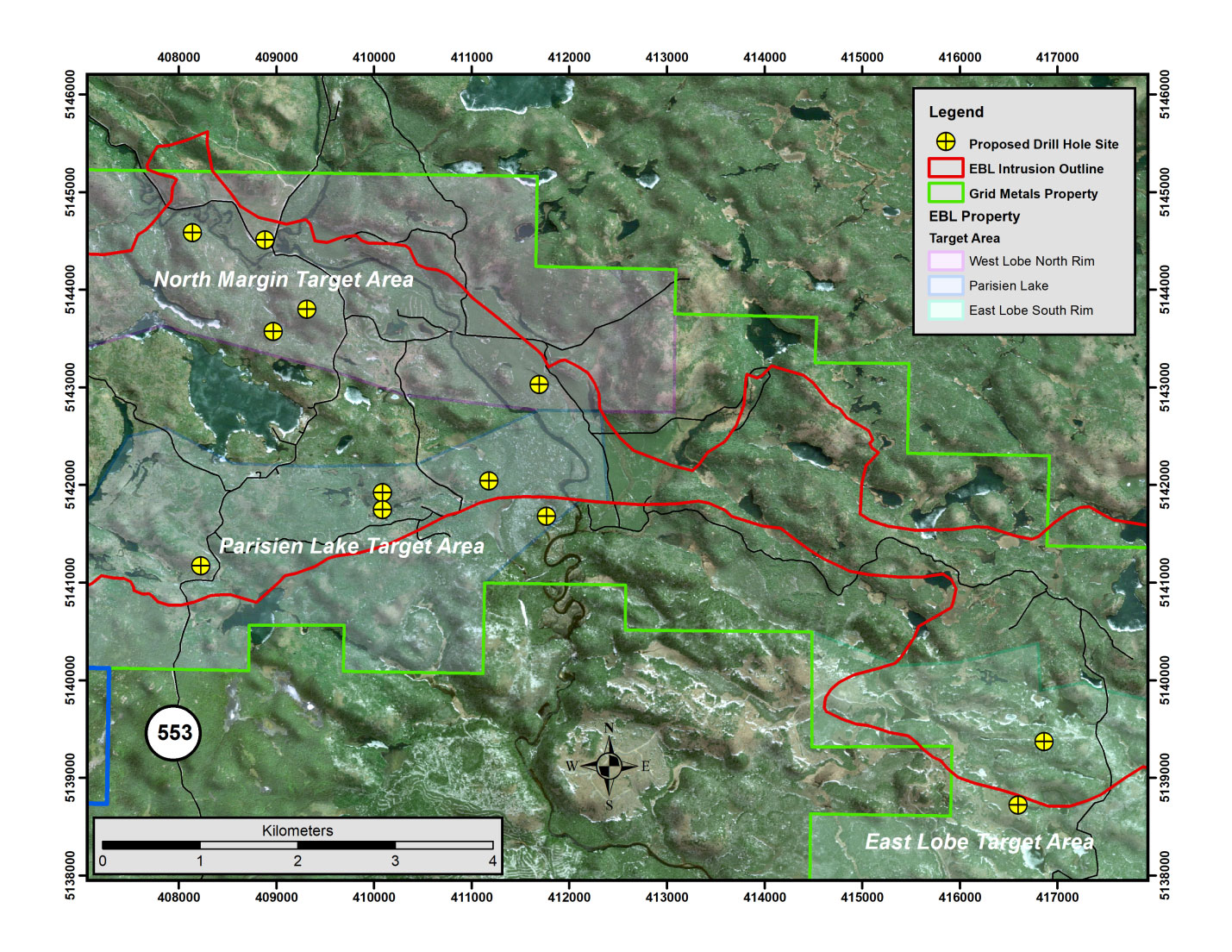 - Approximately 5,000 metres are planned in 9 diamond drill holes covering three large target areas in the highly prospective EBL intrusion
