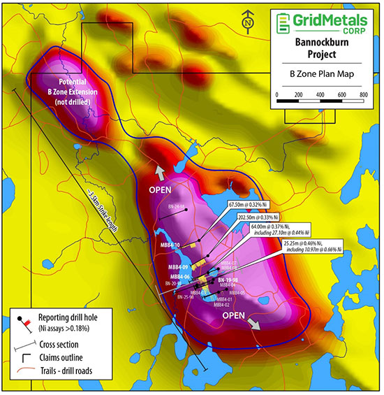 Above: Total field magnetic intensity map of part of the Bannockburn Nickel Sulphide Property showing interpreted outline of the large ultramafic body that hosts the B Zone Mount Keith-type disseminated nickel sulfide mineralization. Historical drill holes from Outokumpu Mining (BN series) and Grid Metals (MB series) that intersect the B Zone are also shown. Source: Grid Metals, January 2021.
