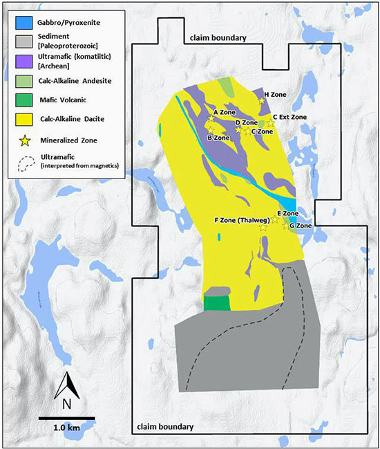 - The B Zone occurs within a ~3.5 km magnetic anomaly that is related to a serpentinized ultramafic body believed to have originated as an adcumulate dunite intrusion similar to that hosting the Crawford nickel deposit.