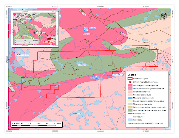 Grid Metals Corp. (TSXV;GRDM) (OTCQB:MSMGF) (the "Company") is pleased to announce the signing of an option agreement to acquire a 100% interest in a previously undiscovered and prospective spodumene and lepidolite-bearing pegmatite lithium property located approximately 250 km northwest of Thunder Bay (see Figure 1). The property (herein referred to as the "Campus Creek property" or the "Property") hosts at least one highly fractioned and rare metal-enriched pegmatite dyke (the "Highstone dyke") evidenced by high-grade lithium and highly anomalous cesium, rubidium and tantalum values obtained from Grid's initial surface grab sampling.